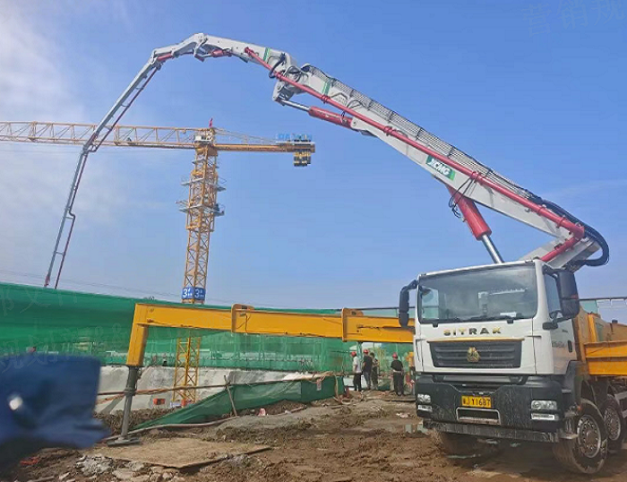 面临装备交织施工,,,,作业空间受限。。。。。。。62米泵车依附单侧支持模式,,,,仅用一半园地就完成了稳固架设。。。。。。。