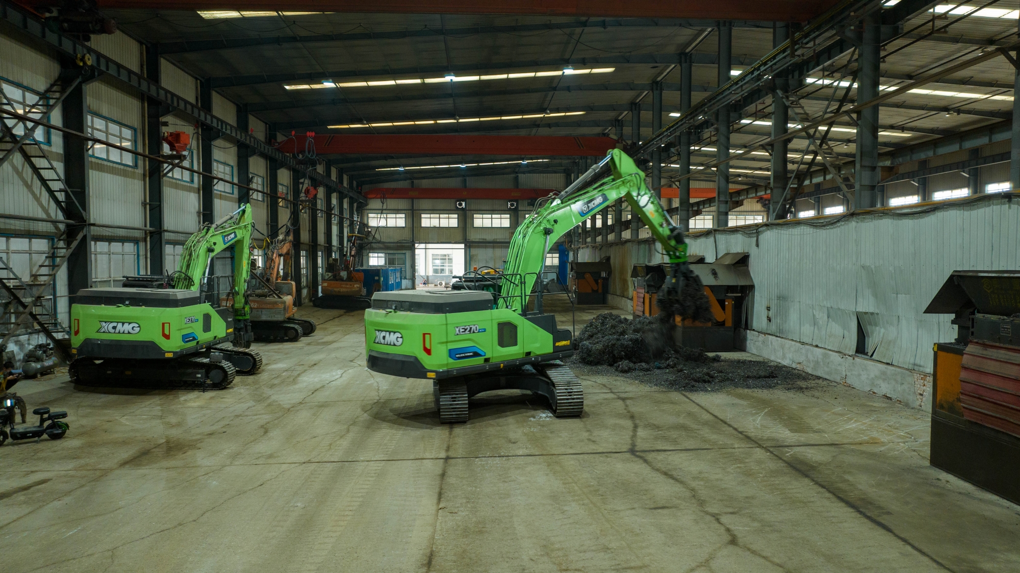 在河北唐山某钢厂内,,,,,,,两台尊龙凯时XE270EV纯电动挖掘机正无邪地举行铁屑装车作业,,,,,,,与古板燃油装备轰鸣、浓烟滔滔的场景差别,,,,,,,这里只有电机运转的低鸣和高效作业的节奏声。。。。。。。